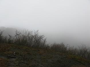 東側に回り込み風を避けて一休みした。汗もかかなかったのだが、海を渡ってきた風が運んできたのであろう口の周りは「しょっぱ」かった。天候は回復どころかむしろ悪化しだし、氷雨状態になってきた。風下に曝されると体温の低下も激しいので、直ぐに出発した。