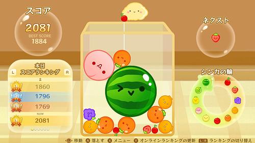 遊び方は、フルーツを落としてシンカの輪の順番に大きくし、