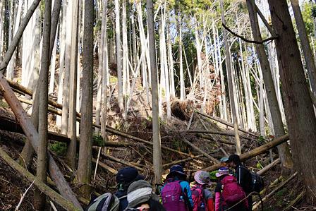さて、昨年下見をした仲間が、「ユリ道のV字谷が大崩落し、倒木が散乱。続いて滝谷峠から奥貴船橋まで樹々が、なぎ倒され、荒れ方がひどかった」と驚いていた。