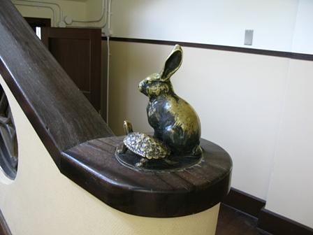 豊郷小学校旧校舎の中央玄関を入り、左側の階段手すりに初めて現物のウサギとカメを見た。兎は余裕があるかるような表情をしていたが、亀は鎌首を上げ闘志満々であった。この小学校で学んだ子供達は、ここを通るたびにブロンズ像を触り続けた結果、磨り減り鈍い光沢を放っていた。