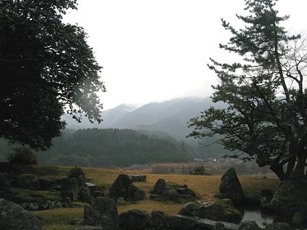 日を改めて小雨の中、秀隣寺庭園に訪れた。庭園には雨にぬれた石組みの亀島、鶴島、中央付近の自然石の石橋が配置され、その借景に横たわる蛇谷ヶ峰があった。