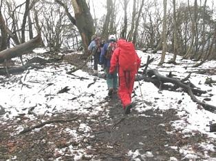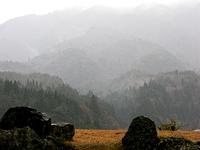 早々に来た道を通り下山にかかった。雪混じりの氷雨が降り出し、辺りを雪景色に変えていった。滑りやすい急斜面であったが、バランスを取りながら一気に駆け抜け「畑」に戻ってきた。集落のある辺りまで下って来ると、あれだけ寒かったが、嘘のように温かであった。