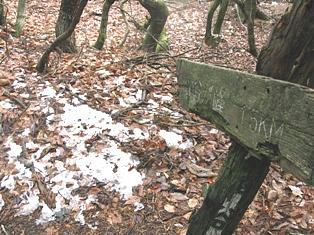 ここからは、緩やかなアップダウンの稜線歩きとなった。 10分ほどで「滝谷の頭」朽ちかけた年期の入った道標に出合った。 標高点P752を過ぎたあたりから、薄っすらした雪が地面を覆っていた。標高P790m辺りから始まる急登をこなし、後は、なだらかな登りで蛇谷ヶ峰に着いた。