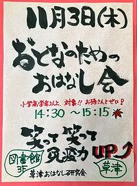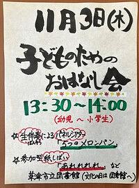 2022年11月02日 図書館まつり告知 草津おはなし研究会 • 草津市 詳細 お知らせ 親子でおはなし会 おはなし会《大人》 おはなし会《イベント》 祭り、図書館 イベント お話 お気に入りに追加 明日11月3日(木)祝草津市立図書館(本館)で図書館まつりが開催されます。草津おはなし研究会も午後から子どものためのおはなし会と大人のためのおはなし会をします。事前申し込みはいりませんので是非来て下さいね この記事を報告する 不適切な内容や規約違反を発見した場合はご報告ください