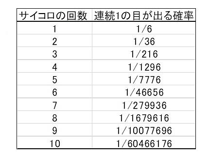 もう一度話すが、サイコロを振って1目を出して、更にサイコロ振って1目を出し、また振って1・・・また振って・・・9回連続1目をだす。