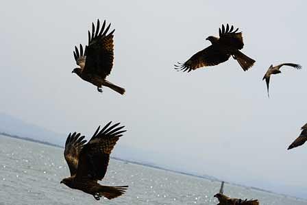 猛禽類は、強大な翼を広げ、鋭い眼差しで白い舞姫たちの間を突き進んだ。ユリカモメたちの優雅な舞を支配しようとするかのようだった。