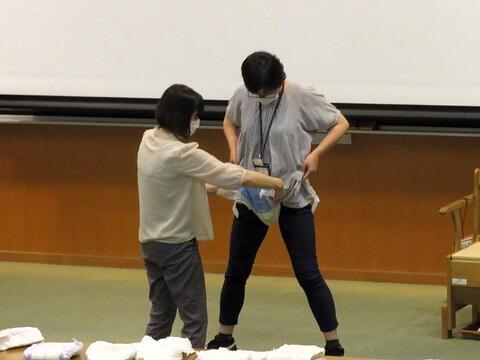 また、実際にバッド、おむつを配り、おむつをする実習も行いました。