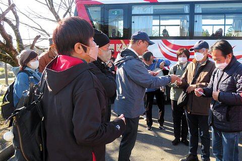 木ノ本駅からバスで、己高庵近くの駐車場に着いたところで、事前に購入していた協力券を参加メンバーに手渡す岩永さんです。