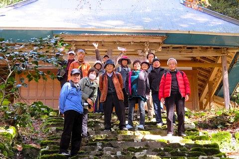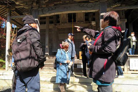 本堂前で一男さんの説明です。 鶏足寺の謂れをはじめ興味深い話でした。