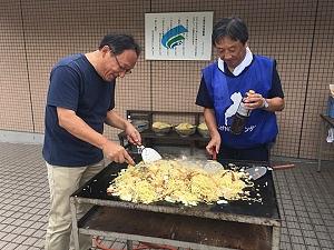 焼きそば、焼うどんに1時間。写真を撮る暇もなく、頑張っている姿を写真に撮っていただきました。三原市社協の吉岡事務局長との還暦コンビです。
