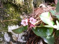 地面を這うように伸び、ピンク色の釣鐘型の花をつけたイワナシも見られた。春ならではの開花の時期にでくわしたことに全員大満足になった。