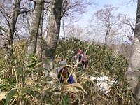ネマガリダケの藪に突入した。竹のなびき具合が気になる。行きて方向に寝ていれば何とかなるが、起き上がってくる方向の竹は始末が悪い。約80m下った。鞍部付近では雪解後の笹が曲がったまま道を覆っていて滑り易い。