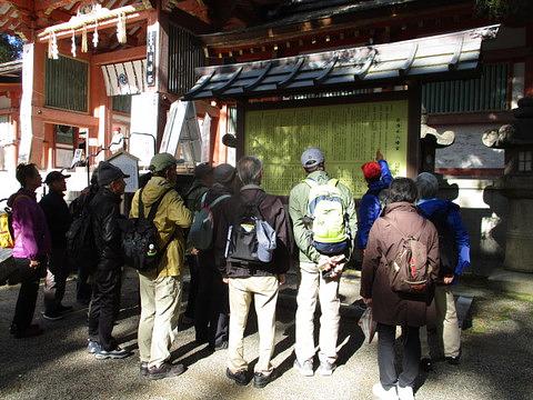 八幡宮の成り立ち、歴史等を真剣に説明を聞くメンバー。