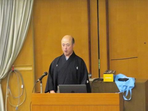 能楽自体の説明から始まり、歴史を説明され、能舞台(室内に作られたものは能楽堂)の構造や、鏡板の説明があり、能楽は神事でであることを再認識しました。 また笑いをとる方向に行ったのは狂言。