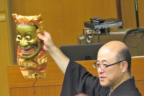 また、能楽に使われる豪ぐ(楽器)について、能管(笛)、小鼓、大鼓、太鼓の説明をされ、持ってこられたお面一つ一つを掲げられ、説明をされました。