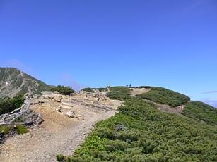 ハイマツに囲まれたやせた岩稜帯を下り最低鞍部まで下がった。ここは、岩場であるので慎重に行動した。この先で登山道は2つに分かれる。直登ルートと右にトラバースしていくルートがあったが、赤印もあったので直登ルートを取った。花崗岩の砂礫化した斜面は、滑りやすいので転倒しないようにゆっくりと登っていった。 頂上には、大きな祠と一等三角点があった。
