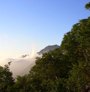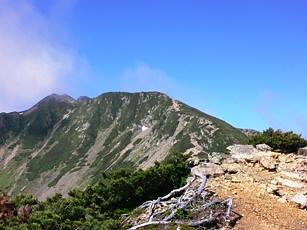 北沢峠のバス停付近は、うつそうとした原生林に覆われ、南アルプス特有の雰囲気がかもし出していた。早朝のためか人影もまばらで、より強く感じた。二・三合目の樹木のなかをもくもく登っていった。少し傾斜が、ゆるくなり、平坦になった滝ノ頭五合目に辿り着いた。ここで、小休止して、二つの道に 分かれるが、仙丈岳に向かって、直進した。いつの間にかダケカンバ帯からハイマツ帯となった。