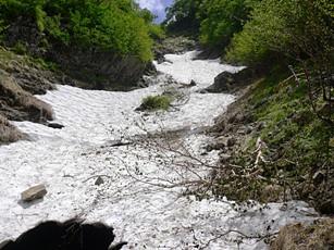 この沢には雪渓があり、ルート上には、大きな陥没ができていたので、まわり込んで沢を渡っていった。