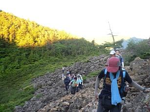 水仙小屋の朝は早く、3時30分に一斉に電灯が点き、4時から朝食し、行程も若干長いので、薄明かりのなか出発した。