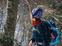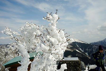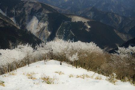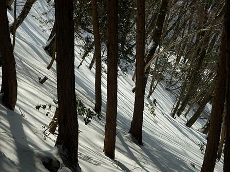 冬季だけ伝う尾根筋は、ずり落ちるほどの急斜面である。掘り込まれた雪の踏み跡を選びながら、登っていくと、樹氷の破片がいたるところに散乱していた。周りの木々は、冷たい付着物を拭い去り、樹肌を生き返らせていた。