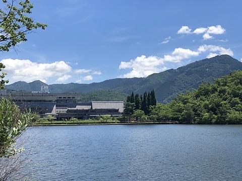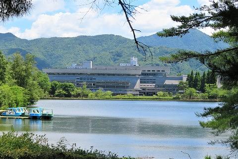 さらに進むと、手洗いのある休憩所で、休日の為休んでいるボート、比叡山を背景にした国際会議場が見えました。