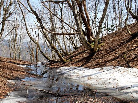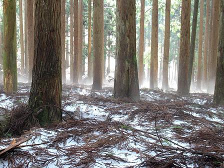 融けきらない雪の吐き出す冷気の仕業で、林床が靄(もや)ていた。