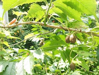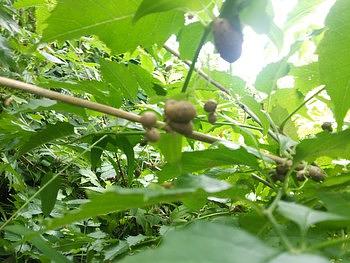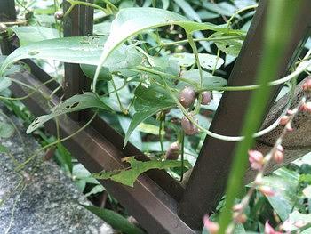 ノウゼンカズラの枝にくるくる巻き付いている蔓に、むかごが鈴なりになっていました。