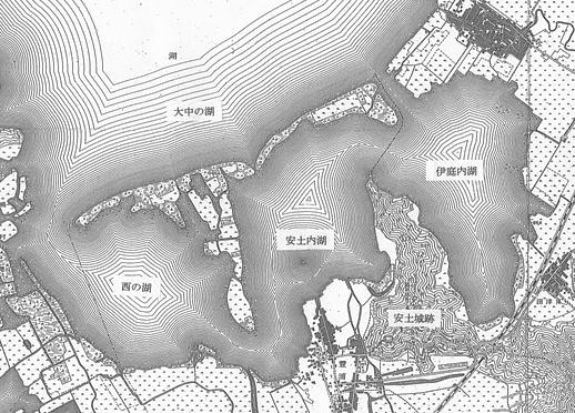 この地形図が明治26年測図(大日本帝国陸地測量部)です。安土山(安土城跡)は、伊庭内湖、安土内湖そして西の湖に囲まれ、その北には大中の湖があったのです。この間、土木機械もなく、たかが人力による土木工事が行われたとしてもたいしたこともないので、この地図通り安土城は、三方の山麓まで琵琶湖の内湖がせまり、半島状の突き出した地形に築城されていた。信長が思い巡らした水上城のイメージが浮かんできます。