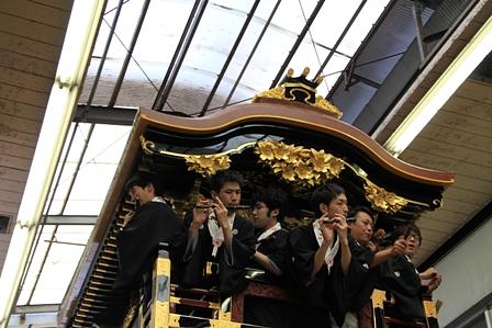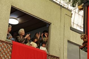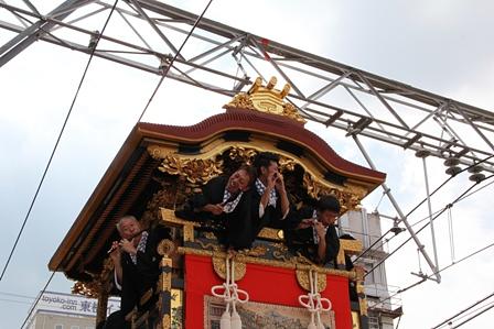 所望との声がかかり、曳山が止められた。なぜ止まったのかわからなかった。責任者の方が五色布を結んだ指揮棒をつきあげ、これを合図に「からくり」が動き出した。この「からくり」を披露するために止まったことが判った。 演技が終わると見ていた人達から一斉に歓声と拍手が起こった。私もじっとしているのも「ばつ」が悪いので、皆と同じように手を叩いた。こうすることが、「からくり」を見物するための作法であり、行動を共にすることにより、いち早く祭りの雰囲気に馴染めることも分かってきた。