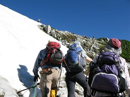 当初の計画では、全員で宝剣岳を越え、できれば木曽駒ガ岳を目指していたが、軽い高山病の症状が出た。3名は計画通り宝剣岳を越え、5名は、残念ながら往路を辿ることになった。
