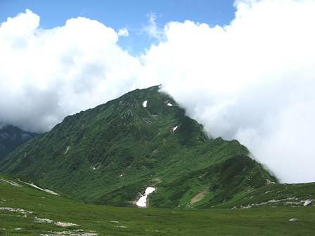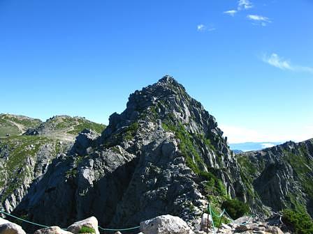 慰霊碑のケルンが立つ草原状の幅広い尾根まで登ると山頂は近い。東側の山腹を絡むように登り、緩やかな斜面を回り込むと大きな露岩が積み重なった三ノ沢岳(2847m)山頂がみえた。私は事情があり、頂上1m手前で、往路を辿った。