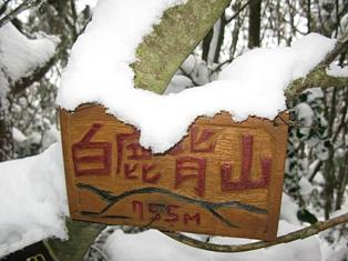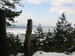 簡易水道の管理施設のあるところから登りだした。ゆっくりとした足取りで順調に進んだ。P509mを少し通り過ぎた辺りから尾根筋の山道を辿った。薄ら雪化粧した雑木やブッシュが途絶えたところで、眼下には東近江平野が手に取るように広がり、集落は雪に埋まっていた。空気が澄みきり、遠く琵琶湖まで見通せた。