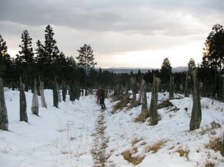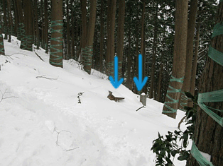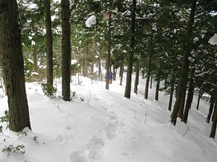 植林帯のアップダウンの繰り返しが続いた。いつ終わるとも知れないラッセルに嫌気がした。ただひたすら前進した。直ぐ眼の前に集落がある里山であるにも拘らず、多量の雪があると、一歩前進するにも大変である。
