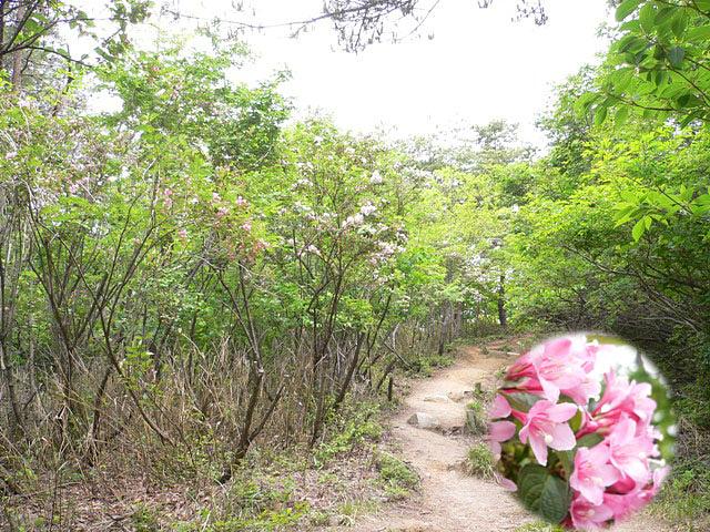 とすぐに丸太が付設された階段が続く。この辺りは、花崗岩質の風化が進み、階段内の土砂は流失され、丸太のみが残り非常に歩きにくい状態だ。殆どの人が階段を避けて歩くため、階段の脇の傾斜部には踏み跡が出来ていた。調子ガ滝分岐を過ぎると少し勾配が緩やかになって、木々の隙間から琵琶湖も見えた。小生の背丈175㎝より少し高い潅木にピンク色の花が咲いていた。この潅木に「タニウツギ」と書いた表示板が付けられていた。この潅木が群生しているのではないかと予想したが、その通り、次から
