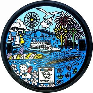 平成10年10月1日に市制施行100周年を迎え、これを記念して、大津市にふさわしいマンホール鉄蓋のデザインを公募しました。審査を経て、最優秀賞に選ばれた作品をもとに、大津市制100周年記念マンホールキャップを製作しました。この作品は、市制施行から100年目の大津市の景観をモチーフにしています。 (※)