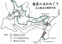 浄蓮坊跡を起点に約1.5kmにわたる巡拝コースを2班に分かれて、ボランティアガイドさんの説明を受けながらゆっくりと散策していった。手渡された案内図には西国三十三か所の観音の霊場ちなんで、観音像に1番から33番までの番号が付けられていた。鎌倉時代から大正昭和までの間に作られた磨崖仏であり、中でも「阿弥陀如来立像」「地蔵菩薩立像」「聖観音立像」の三点が三重県文化財に指定されていた。
