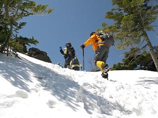 ここから縞枯山頂まで、分岐からしばらくは緩い傾斜だが、途中から急登になった。雪も融けてステップを切って歩けるが、ずり落ちるので止む無くアイゼンを装着。