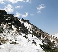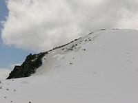 いつの間にかダケカンバ林の限界森林帯を抜け厳しい登りになった。アイゼンの爪を利かし慎重に登って行った。頂上近くには、大きな雪庇が張り出してので、回り込み直下の岩盤帯にでた。