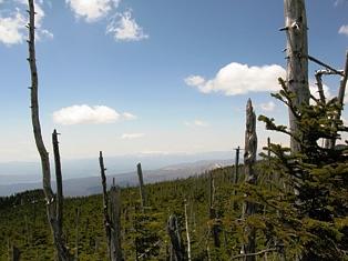 両脇にはシラビソの密林が覆っていた。山名の通り縞状に樹木が枯れていた。古木が枯れ、林内に太陽が射し込み若木も育ち、森林の世代交代がうまく行われているようだ。