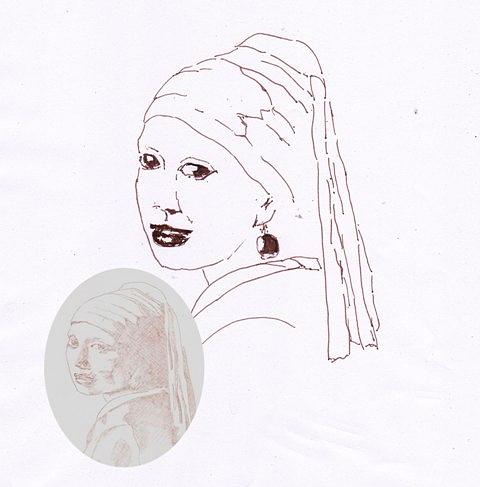 別名「青いターバンの少女」と言われているウルトラマリンブルーその補色とされている黄色の色彩を外し、最小限の陰影にした線だけにしてみた。すると、少女が身に着けている衣装が、際立っていることが目に付いた。