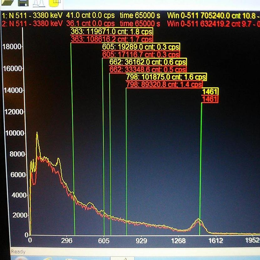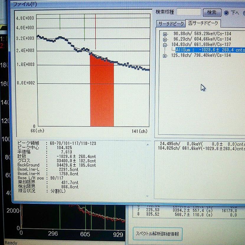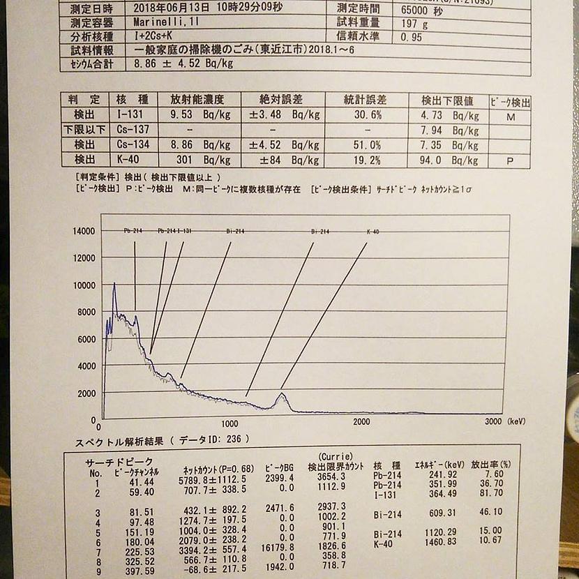 ヨウ素131とセシウム134が検出と表示されていますが、これはウラン系列の天然放射性核種の鉛214とビスマス214のそれぞれ誤検出です。