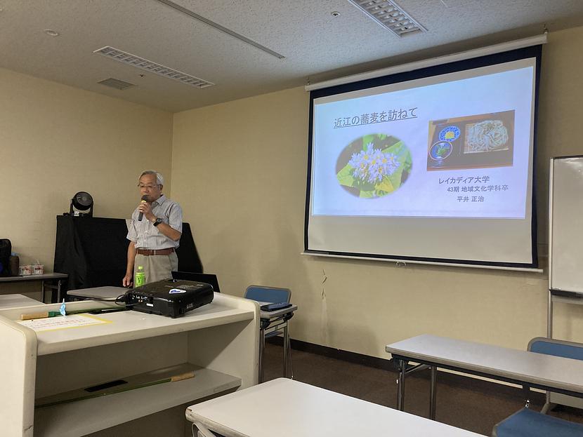蕎麦好きの会員が耳をそばだてて聞きいった興味深いお話だった。平井さんはレイカディア大学43期の地域文化学科卒で課題研究として取り組んだ成果を発表された(写真)