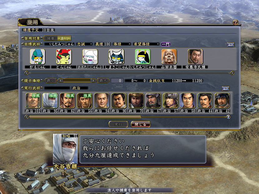 あとは登録武将を「登場する」に選んでからゲームを開始して観音寺城、無ければ安土城や佐和山城などで「人材」→「登用」で登用できます。