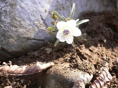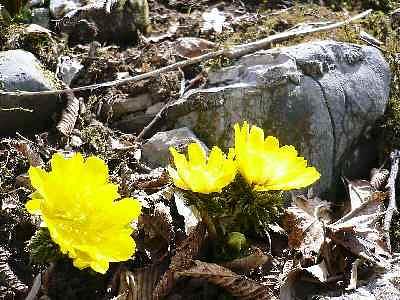 踏み跡がない笹と背の低い灌木のなかを進んだ。突然、鮮やかな黄色の福寿草が群生帯に出くわした。また、鈴鹿の山に春の訪れを告げる「春の妖精」節分草も花を咲かせていた。