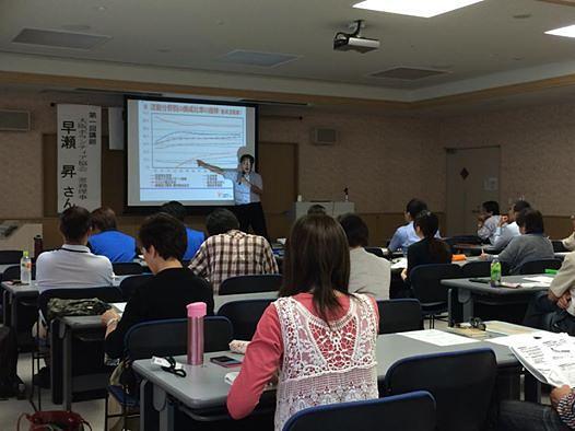 熱く、ユーモアを交えて語り、会場の参加者をどんどん引き込んでいく早瀬さんの写真です↓