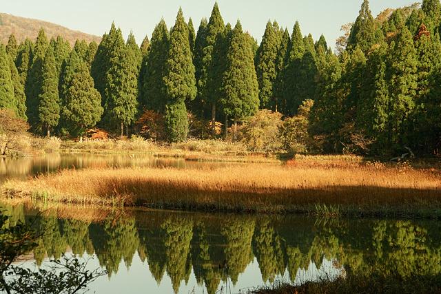 この辺り一帯は、高木のスギ林に囲まれ冷気が漂い、精霊の存在すら感じさせられるところ。とりわけ、平池の成り立ちに興味があった。