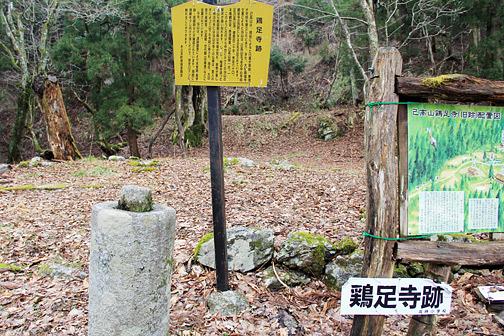 やがて、頂上近くの湿地の広場についた。木之元教育委員会による立札を見かけ、ここが奈良時代に建立された鶏足寺跡と分かった。