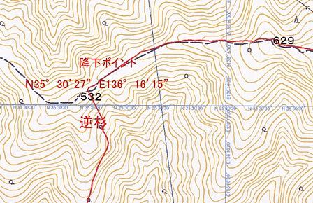 さて、高尾寺跡の「逆杉」へと向かう降下ポイントは、非常に分かりづらい。そこで、仲間が、分岐点の緯度と経度を国土地理の地図から割り出した。N35° 30' 27" E136° 16’ 15”である。