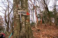 この地点の標高はP532mの地点でもある。ここには、旧飯福寺の案内板のある左の幹に赤ペンキで高尾寺跡への近道を示した目印もある。ただ、薄い字であるので見つけるのが難しい。