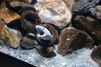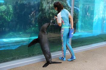 アザラシの水槽では、アザラシが外に出て自分の水槽を外から眺めていました。人工海水100%を使用した、日本初、最大級の内陸型水族館です。
